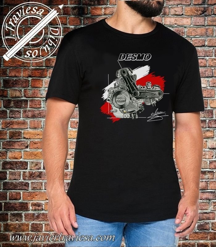 El icónico motor Ducati desmo dibujado y puesto en tu camiseta.