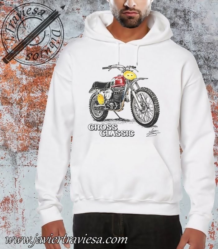 Sudadera blanca con capucha y bolsillos tipo canguro, personalizada con una de las icónicas motos que he dibujado